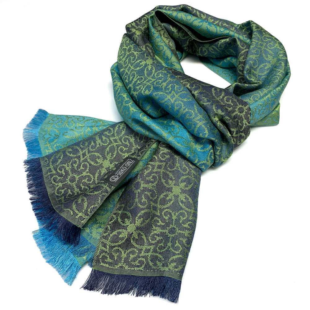 Unsere feinen Schals aus 100 Prozent Maulbeerseide fertigen wir in aufwändiger Manufakturarbeit jeweils nur in ganz begrenzter Stückzahl. Von jeder Farbkomposition gibt es jeweils nur sechs Stück. Sie unterscheiden sich im Webmuster voneinander, sodass jeder Schal ein Einzelstück ist.
