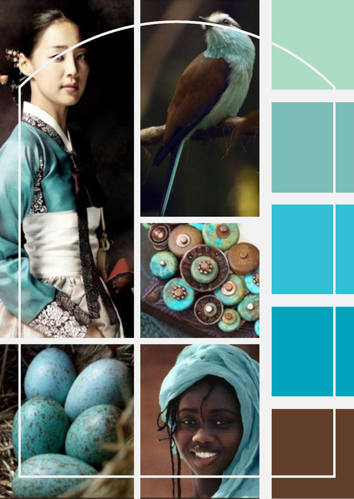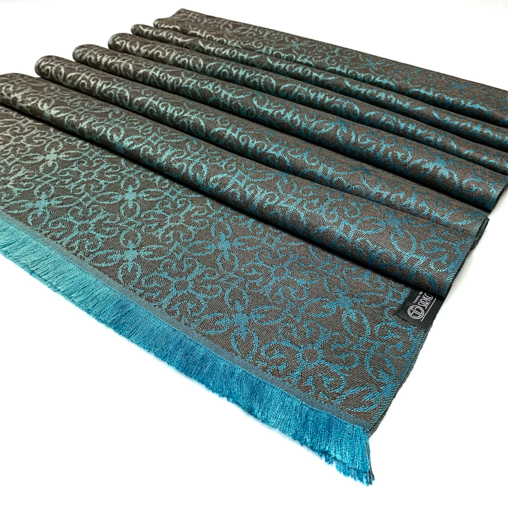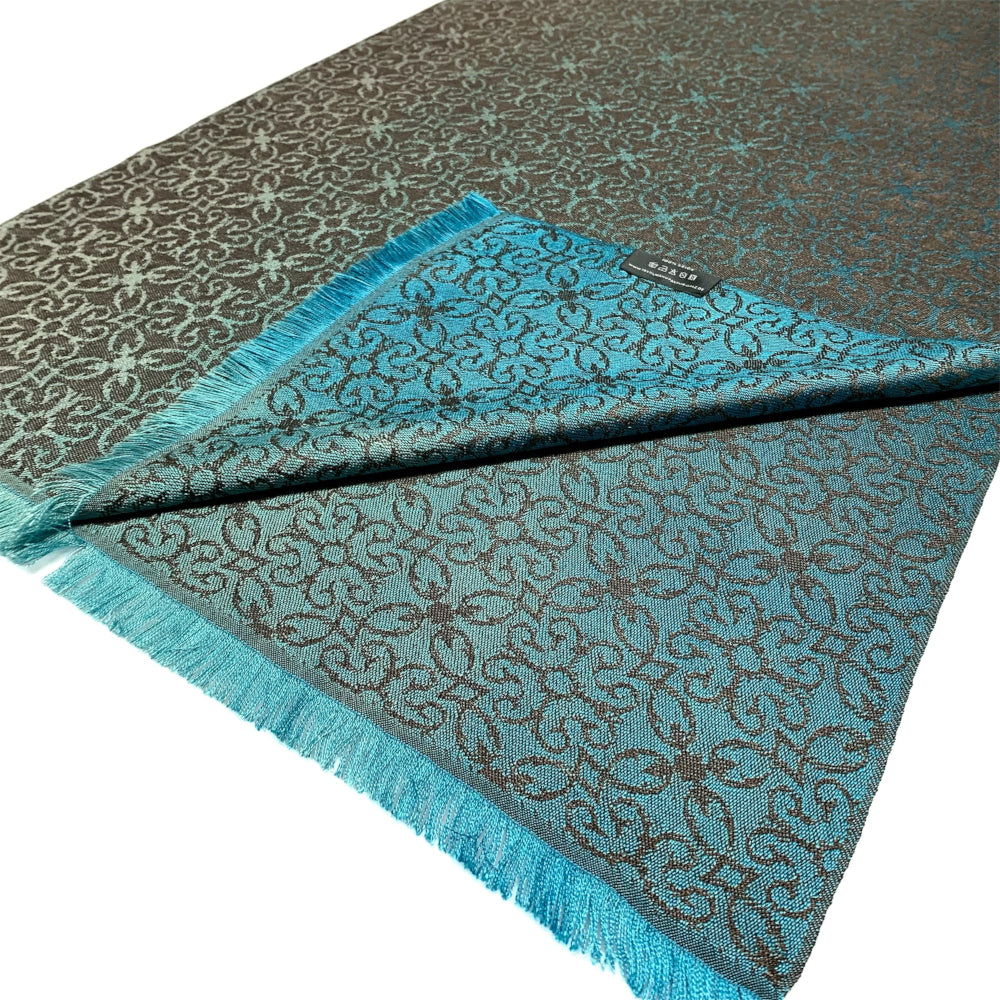 Klassische japanische und afrikanische Textilfarben, Vogeleier, glasierte Keramik und die Vogelart Bienenfresser - das ist die Basis der Farbkombination Apiaster. Die Kette hat einen Farbverlauf von Jadegrün über Wellensittichblau hin zu Bahamablau. Dazu ist im Schuss ein dunkles Teddybärbraun kombiniert. Je nach Seite erscheint das Jacquardmuster Dignos in jadegrün/türkis oder in braun.