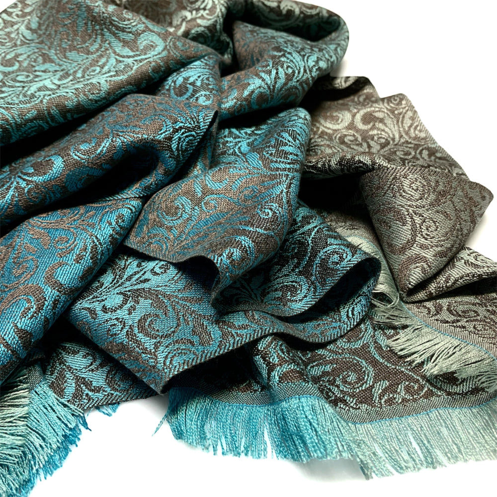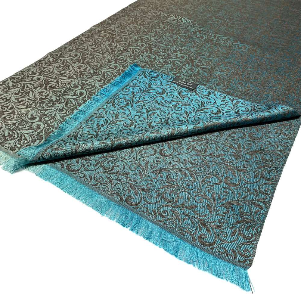 Klassische japanische und afrikanische Textilfarben, Vogeleier, glasierte Keramik und die Vogelart Bienenfresser - das ist die Basis der Farbkombination Apiaster. Die Kette hat einen Farbverlauf von Jadegrün über Wellensittichblau hin zu Bahamablau. Dazu ist im Schuss ein dunkles Teddybärbraun kombiniert. Je nach Seite erscheint das Jacquardmuster Flora in jadegrün/türkis oder in braun.