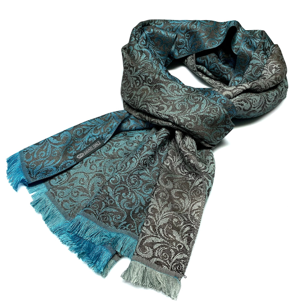 Flora (gestaltet von H. Boudalfa) ist ein üppiges Muster als stilisierten Blättern und Ranken. Es zieht sich ohne klar sichbare Rapportgrenzen über den Schal.