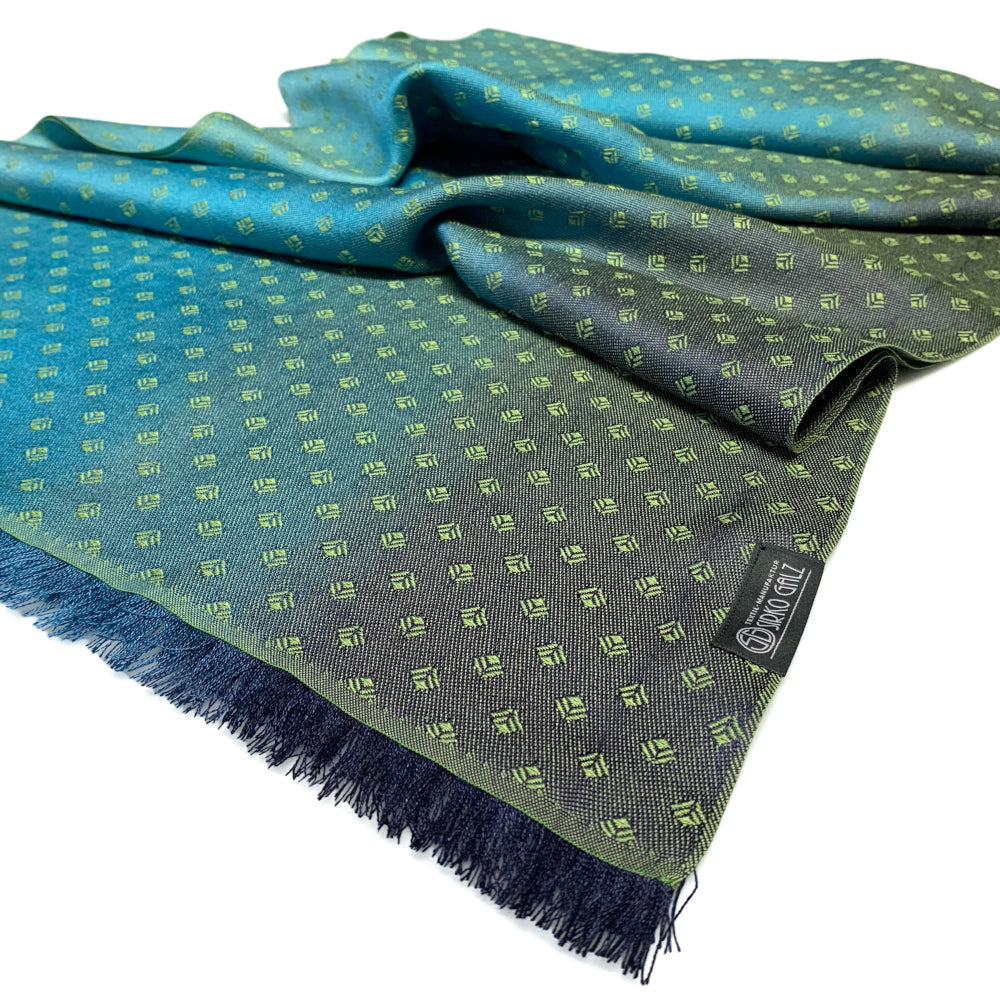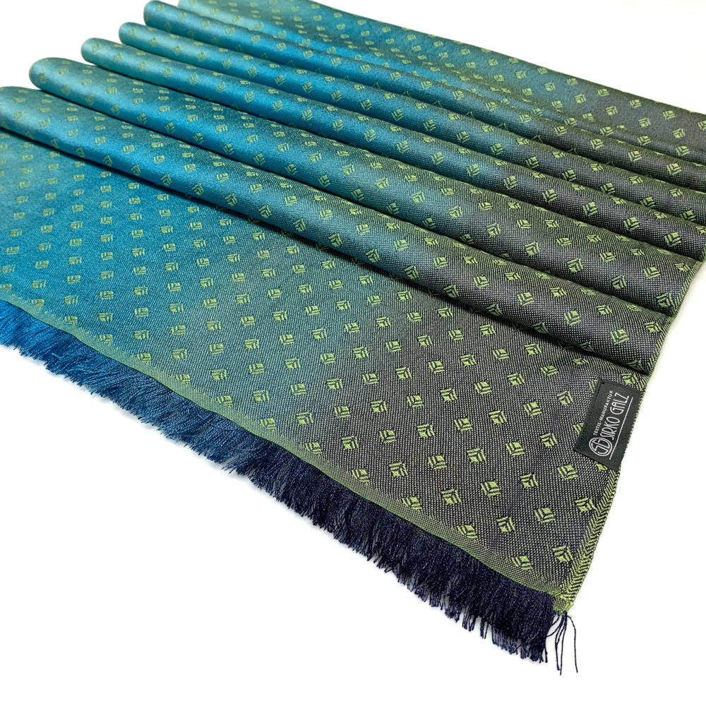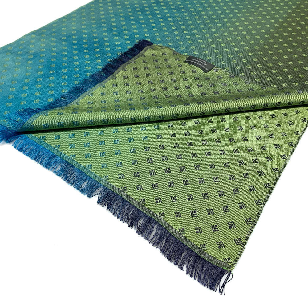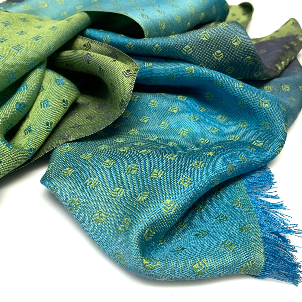 Die Seidenschal-Serie Estrella ist inspiriert von den frischen Frühlingsfarben des Bausternchens. Die Kette hat einen Farbverlauf von einem hellen Alpenblau über Pfauenblau und Cobaltblau hin zu einem dunklen Marineblau. Darauf erscheint unser Jacquardmuster Art Déco in einem hellen Avocadogrün.