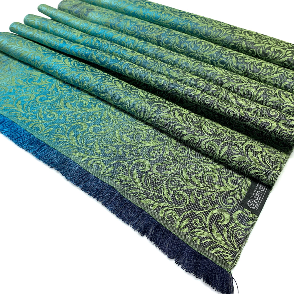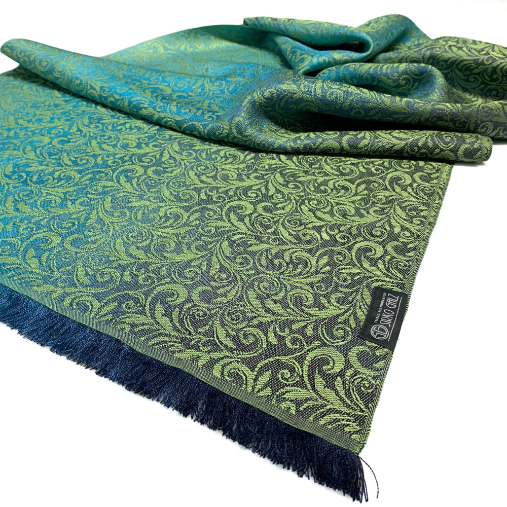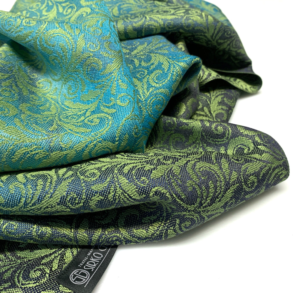 Die Seidenschal-Serie Estrella ist inspiriert von den frischen Frühlingsfarben des Bausternchens. Die Kette hat einen Farbverlauf von einem hellen Alpenblau über Pfauenblau und Cobaltblau hin zu einem dunklen Marineblau. Darauf erscheint unser Jacquardmuster Flora in einem hellen Avocadogrün.