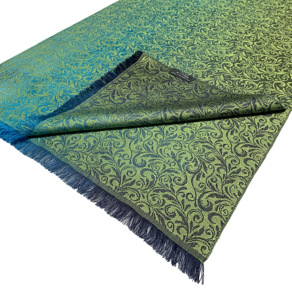 Flora (gestaltet von H. Boudalfa) ist ein üppiges Muster als stilisierten Blättern und Ranken. Es zieht sich ohne klar sichbare Rapportgrenzen über den Schal.