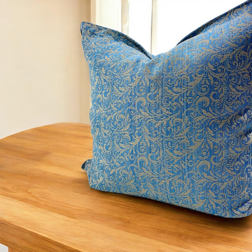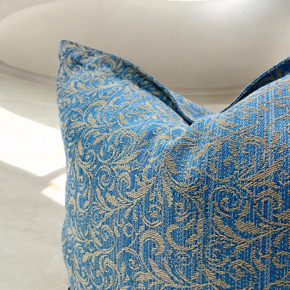 Mit farblich passenden Kissen können Sie unsere Tischwäsche-Serie FLORA GOLDEN BAY ergänzen. In Längsrichtung erzeugen unterschiedliche Blautöne farbliche Tiefe. Die hochwertige mercerisierte Baumwolle schafft schimmernden Reichtum.