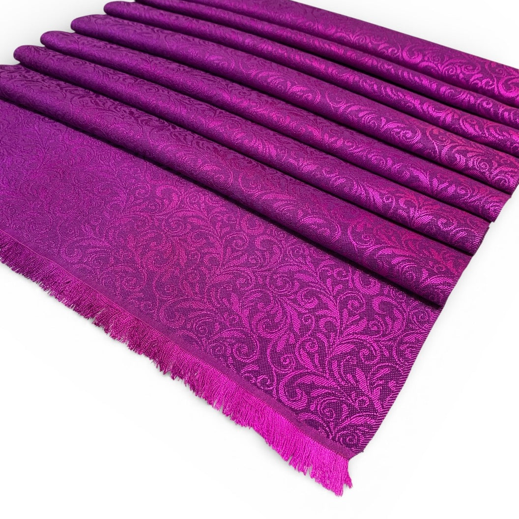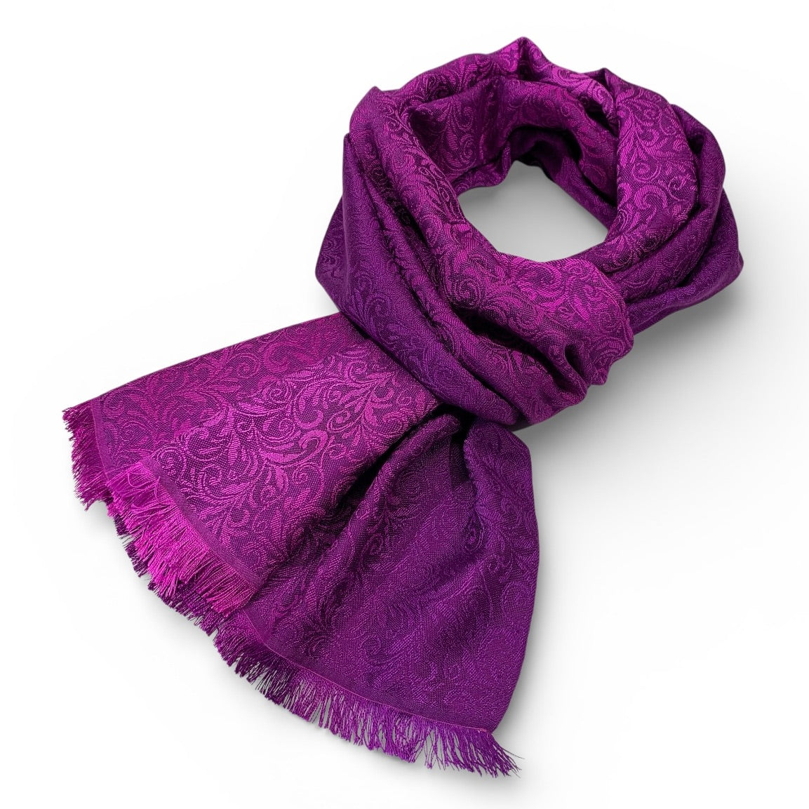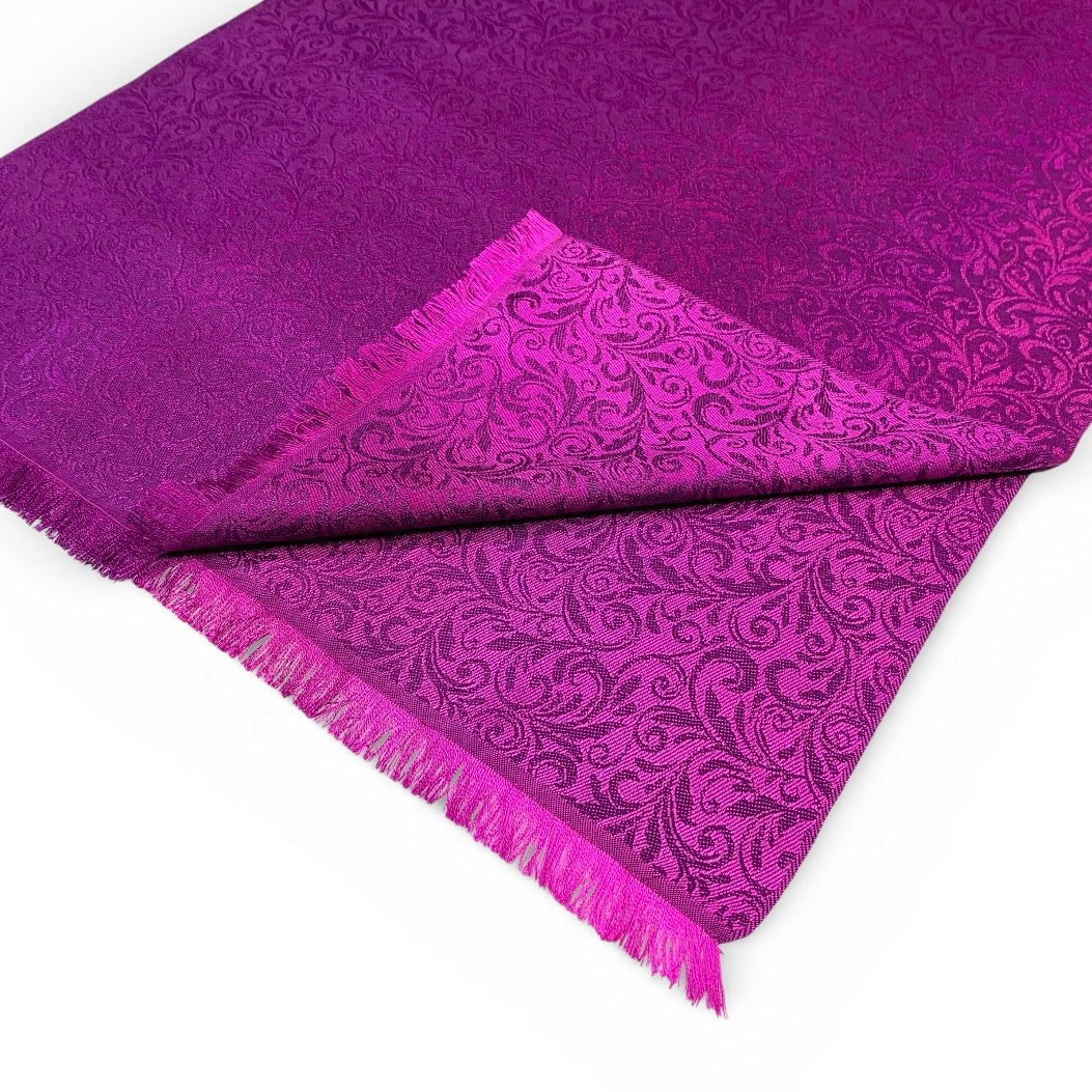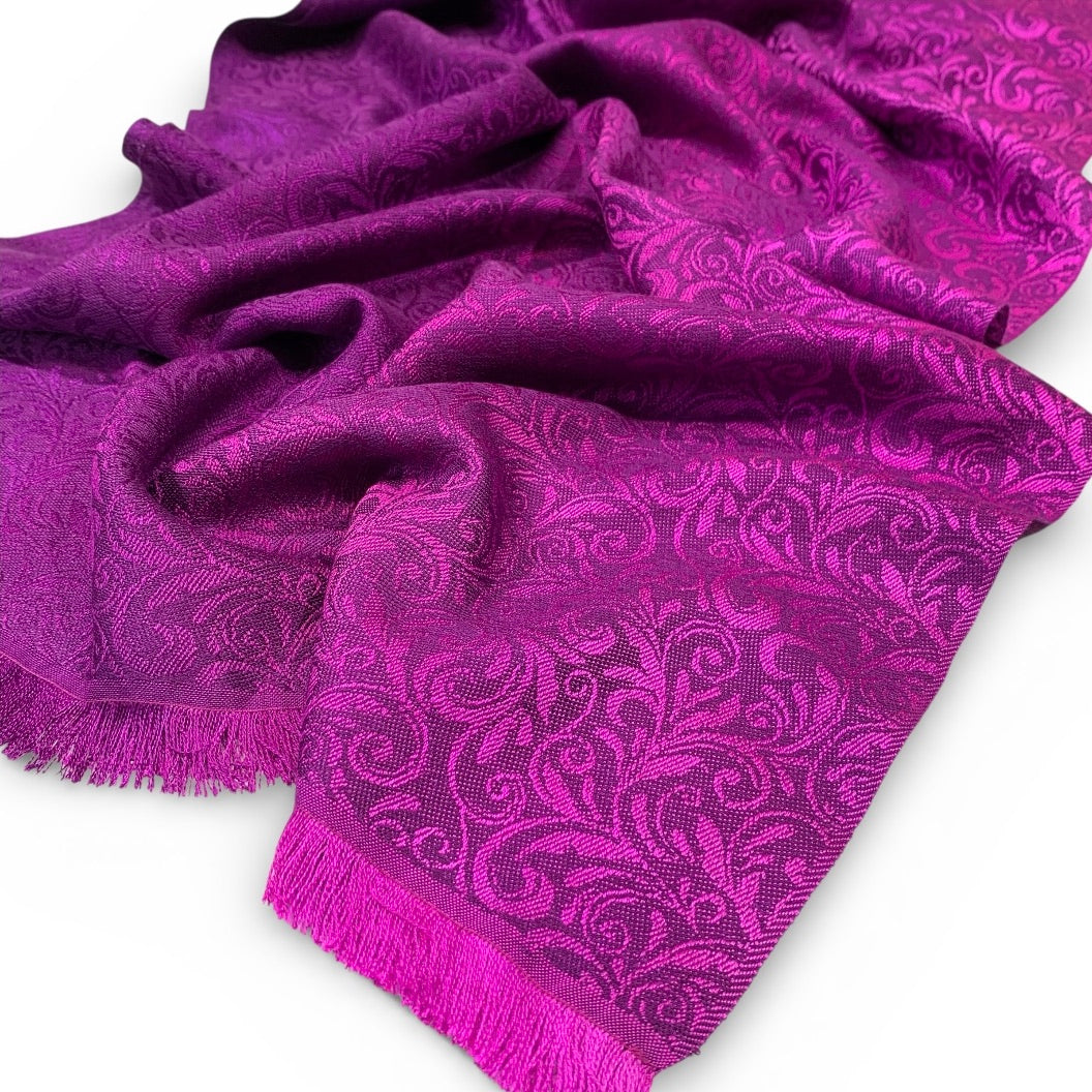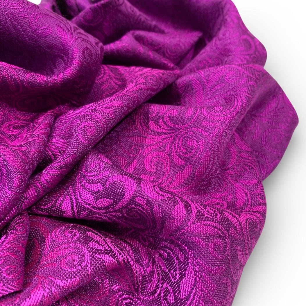 In den kosmischen Weiten zieht ein schwarzes Loch einen fantastisch leuchtenden Gasnebel hinter sich her. Dies ist die Inspiration für die Seidenschal-Serie Agujero. In der Kette mischen sich Fuchsia, Beere und Purpur zu einem Farbverlauf. Der Schuss ist in einem auberginefabenen Ton gehalten. Unser Jacquardmuster Flora erscheint je nach Seite pink/purpur auf dunklem Hintergrund oder dunkel auf leuchtend pink/purpurnem Hintergrund.