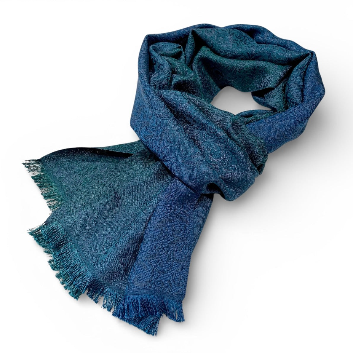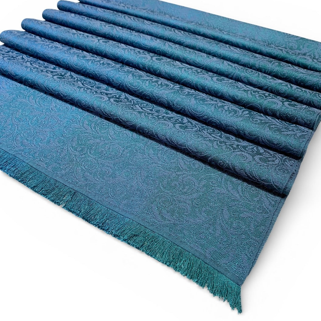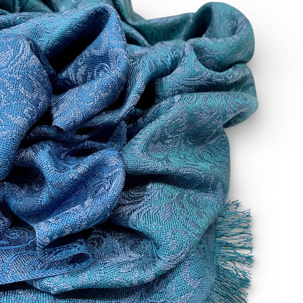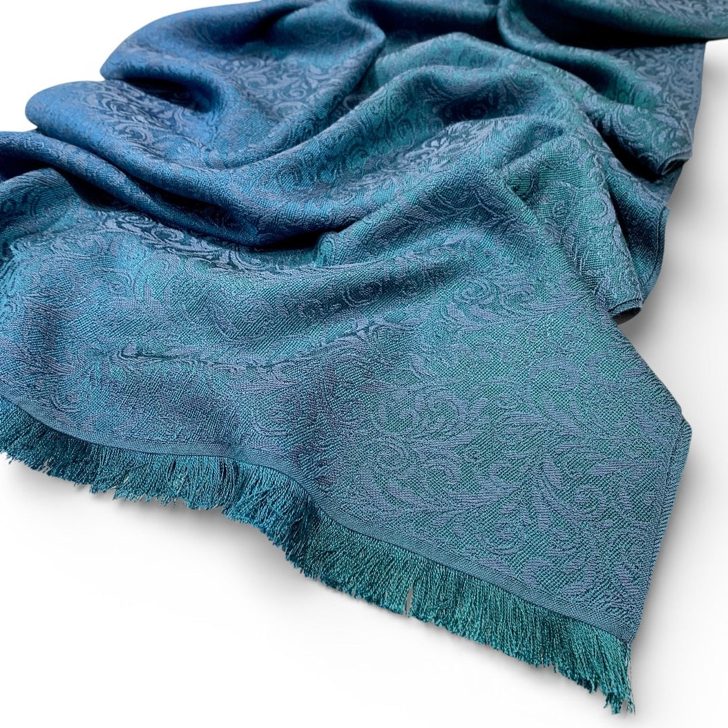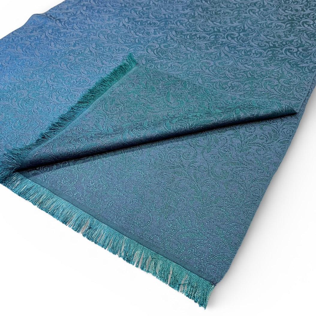 Petrol ist eine nicht leicht zu fassende, facettenreiche Farbe. Die Seidenschal-Serie Espacio de Tensao spielt mit den verschiedenen Nuancen, die dieser Farbton annehmen kann. Dazu verleitet hat uns ein Foto eines Nachthimmels im Gebirge. In der Kette mischen sich Waldgrün und Cobaltblau über mehrere Zwischentöne zu einem Farbverlauf. Den Schuss haben wir in einer Nuance dunkler gefärbt als das Cobaltblau. Dadurch ergibt sich schimmernde Gesamtwirkung. Unser Jacquardmuster Flora ist auf der einen Seite in den verschiedenen Petrol-Tönen sichtbar, auf der anderen Seite in dem dunklen Cobaltblau.