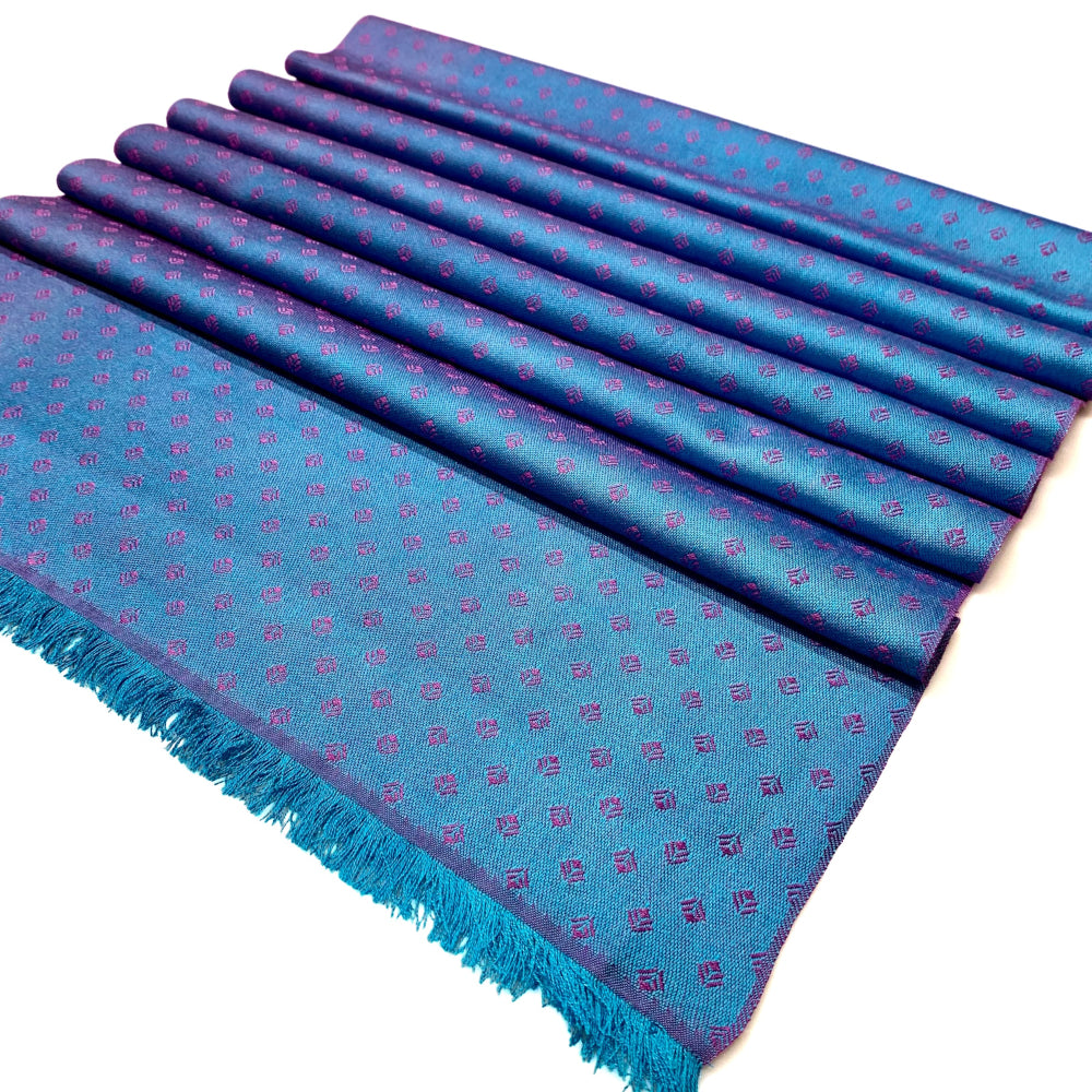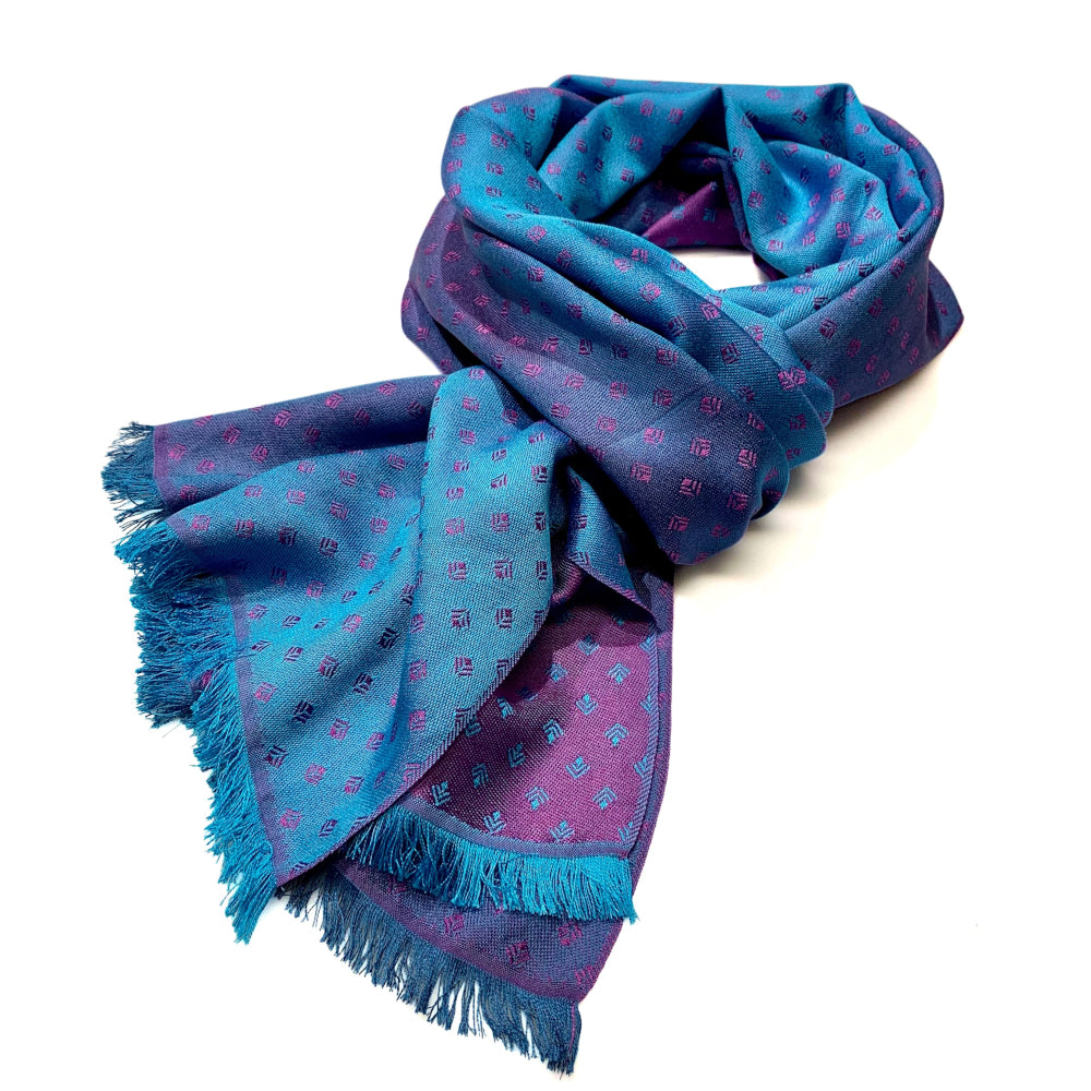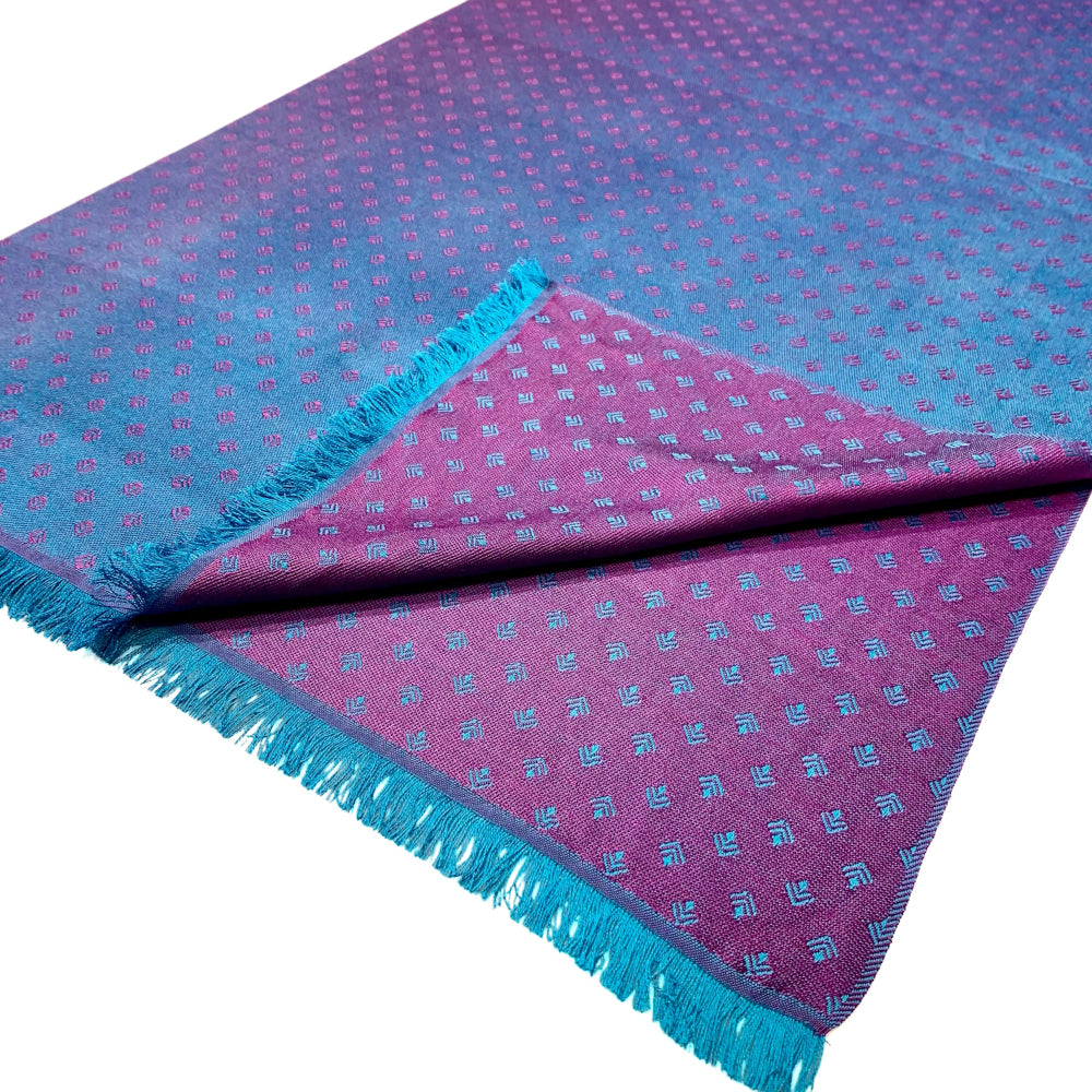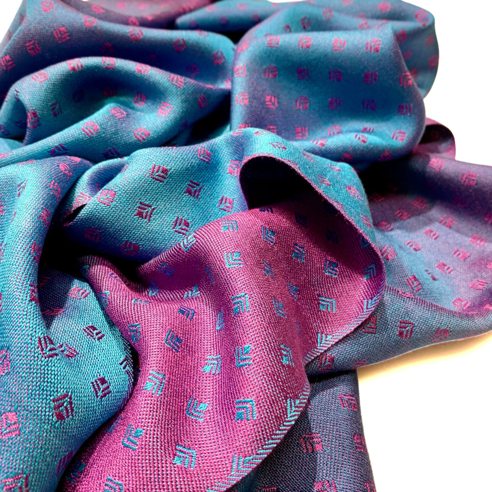 Stellen Sie sich eine Welt vor, in der es purpurfarbene Meere und türkis-kobaltblaue Strände gäbe. Wo Strand und Meer aufeinander treffen, könnte sich die Farbkombination der Schalserie Mare Violaceum ergeben. In der Kette mischen sich Bahamablau und Cobaltblau zu einem harmonischen Farbverlauf, der Schuss ist in einem satten Purpur gefärbt. Das Jacquardmuster Art Déco erscheint auf der einen Seite in Purpur auf blauem Grund und auf der anderen Seite Blau auf purpurnem Grund.