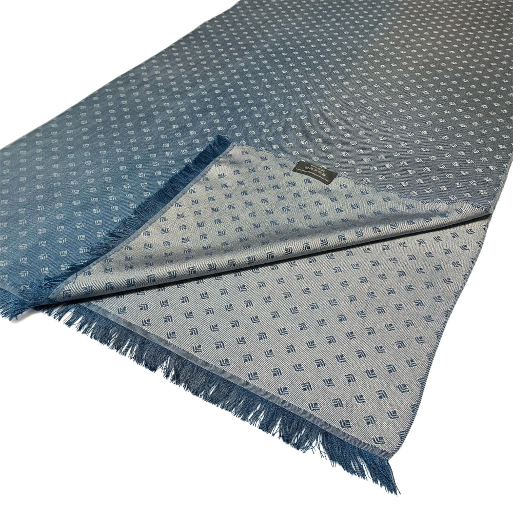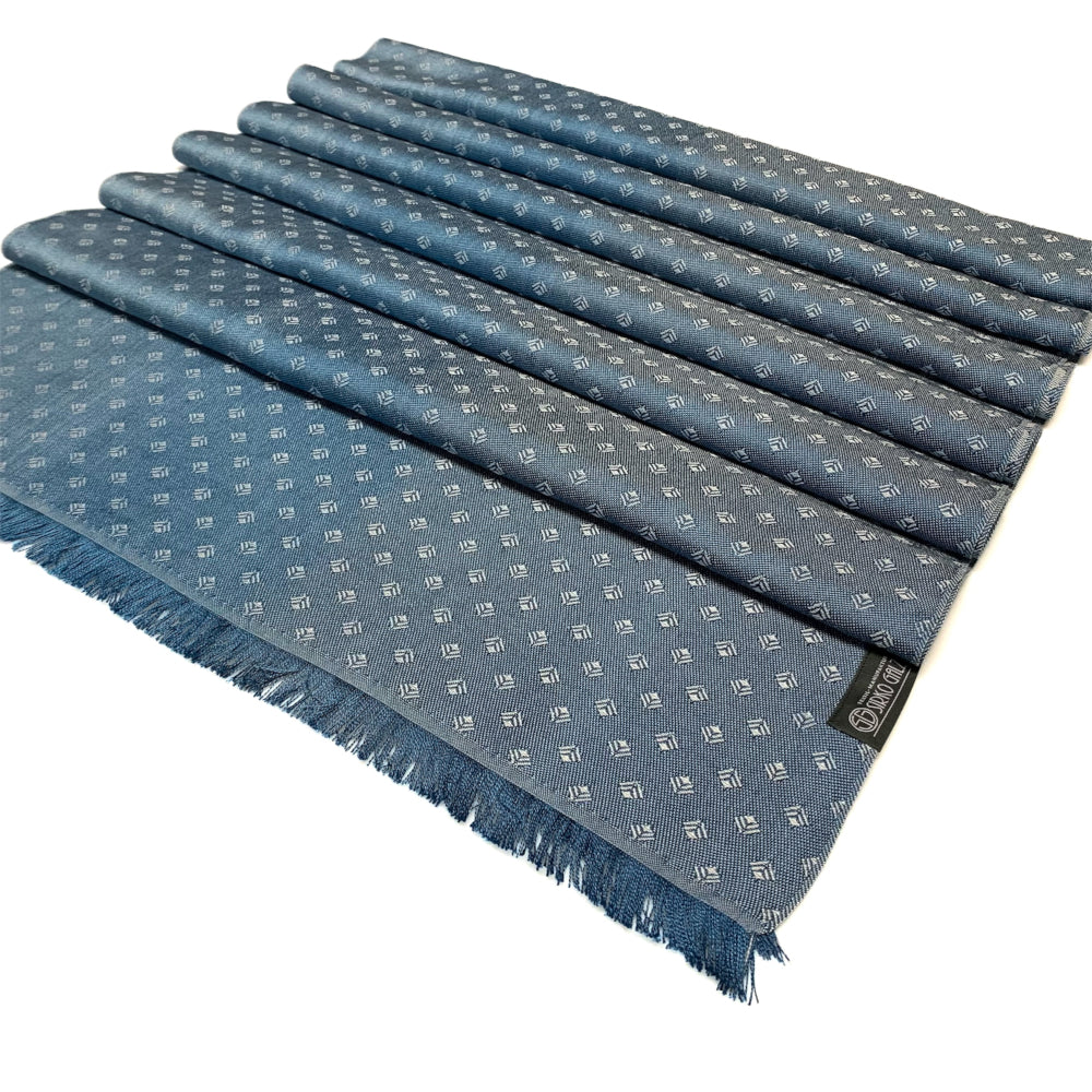 Eine Berglandschaft mit in der Ferne im Dunst verschwimmenden Spitzen und Graten bildet die Basis für unsere Serie Mountains. Die Kette hat einen Farbverlauf in mehreren Blautönen. Darauf erscheint unser Jacquardmuster Art Déco in einem hellen Grau.