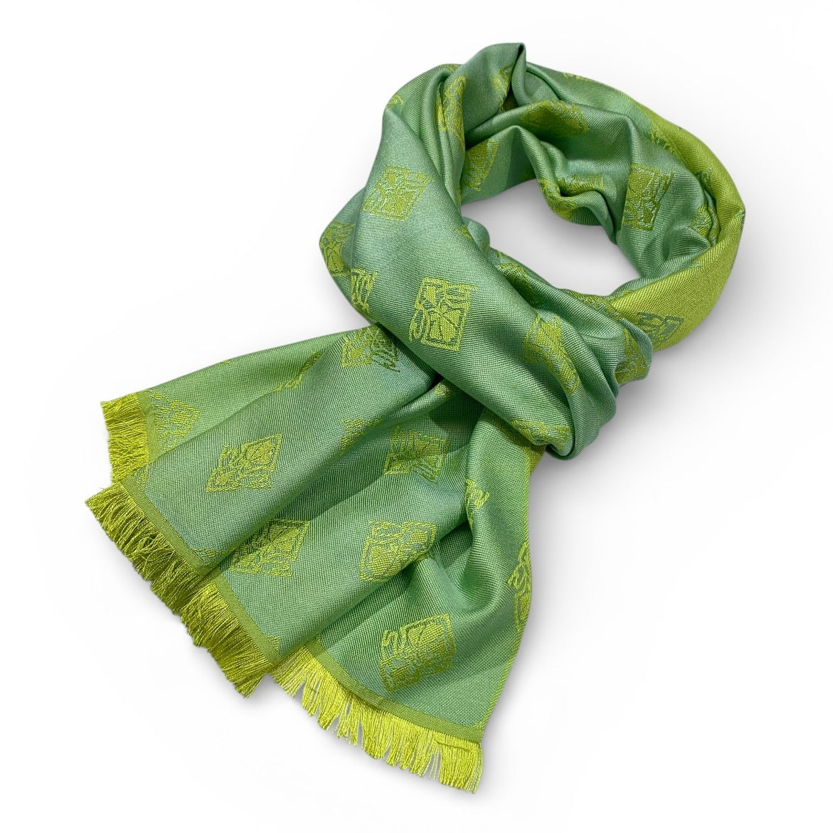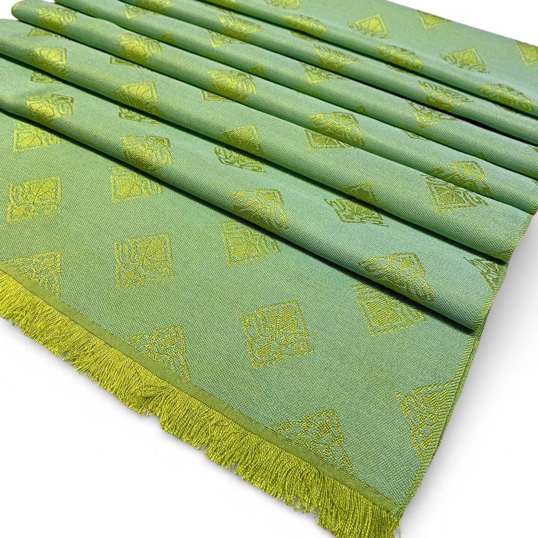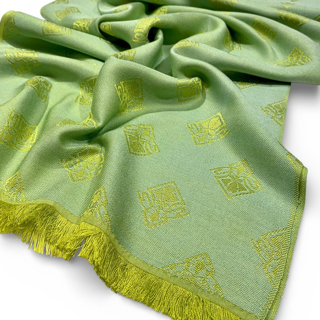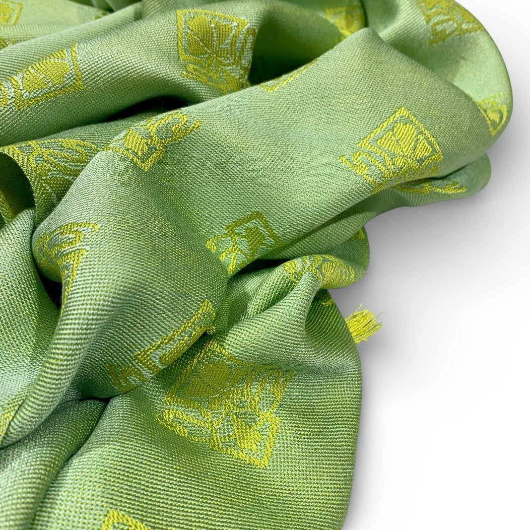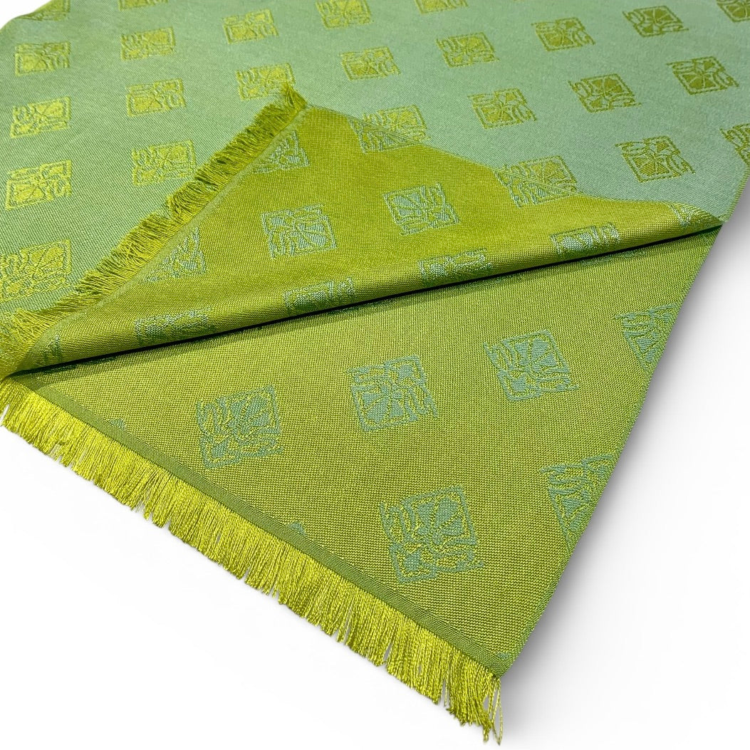 Nell Interno - das Innerste einer Blüte mit ihren zarten Farben in Grün, Gelb und Blau hat uns zu dieser Serie inspiriert. Im Grundgewebe treffen sich Limette, Chartreuse und Gelb zu einem Farbverlauf. Darauf erscheint unser Jacquardmuster Horta Brusselis in einem Silberblau.